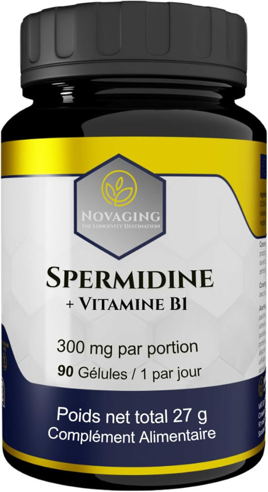 Spermidine 6 mg + Vitamine B1 90 jours - 100% Vegan - Biodisponibilité maximale - Fortement dosé - Sans additifs, OGM ni Allergènes. Made in Europe. Novaging Longevity Program. Spermidine de Novaging Institut incarne l’alliance parfaite entre innovation scientifique et excellence naturelle pour soutenir votre vitalité cellulaire. Chaque gélule délivre 6 mg de spermidine d’origine végétale, enrichie par 10 mg de vitamine B1, afin de promouvoir le renouvellement cellulaire, renforcer les défenses immunitaires et préserver la santé intestinale. Formulé en France à partir d’ingrédients rigoureusement sélectionnés et conditionné en flacon de 90 gélules pour une cure de trois mois, ce complément s’intègre aisément à votre routine quotidienne et agit en profondeur pour renforcer votre bien-être et votre énergie au quotidien