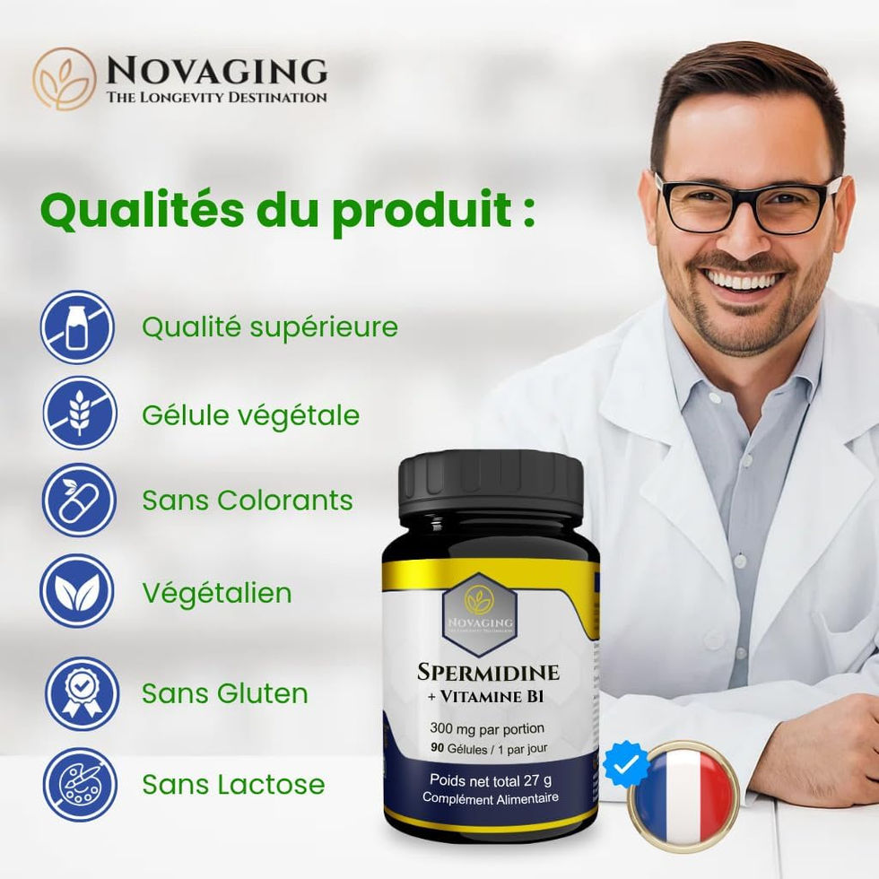 - FORMULATION NOVAGING⏳ Novaging Institut propose une formule optimisée dans une capsule végétale gastro-résistante, garantissant la libération contrôlée de la spermidine au bon endroit et au bon moment pour une biodisponibilité maximale. Chaque lot est soumis à des contrôles qualité stricts (absence de métaux lourds, de mycotoxines et de contaminants) et bénéficie d’une stabilité de deux ans à température ambiante. L’ajout de vitamine B1 renforce le métabolisme énergétique et améliore l’efficacité du processus d’autophagie, vous assurant une synergie active et durable pour un soutien complet de votre santé.
